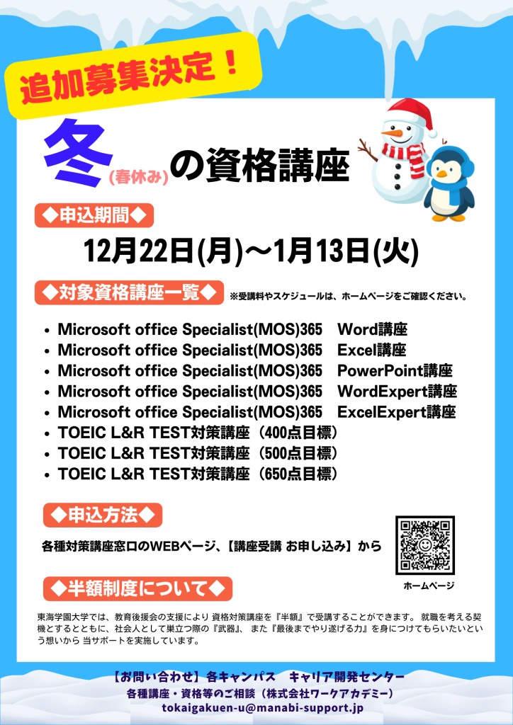 タイトルのとおり、冬(春休み)に受講できる資格講座の追加募集が決定しました!